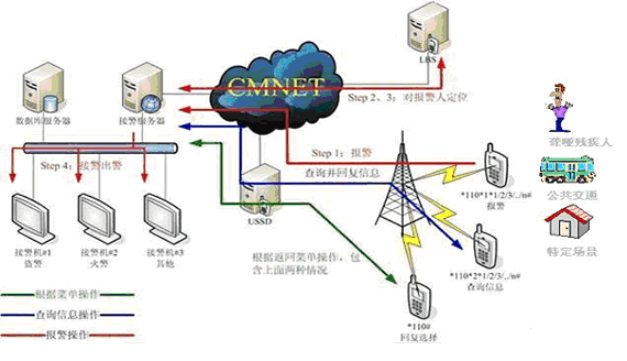 《移動定位快信報警系統(tǒng)》是公眾的報警短消息是通過手機撥打“*110#”,經(jīng)過USSD移動快信平臺和移動位置信息服務(LBS)平臺,報警信息數(shù)據(jù)和報警位置的經(jīng)緯度數(shù)據(jù)信息傳送到110指揮中心系統(tǒng)中,110值班干警通過網(wǎng)絡終端,根據(jù)報警內容和報警人位置信息(電子地圖顯示)等數(shù)據(jù)進行處警,特別情況可以直接撥打電話或通過短信(SMS)交互平臺,進一步與報警當事人進行短信交互。