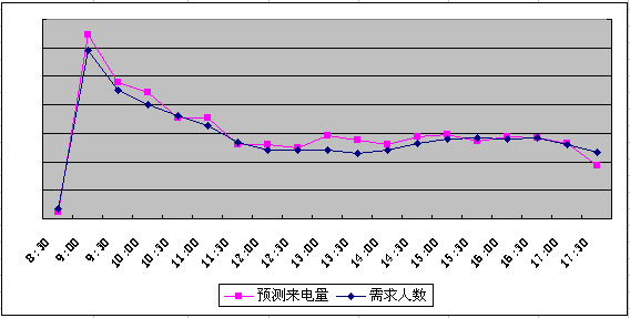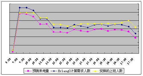 根據(jù)此工具可科學(xué)計(jì)算出每半小時(shí)要達(dá)成目標(biāo)服務(wù)水平所需要配備的人員數(shù)量。如下圖:人員配備的走勢(shì)與預(yù)測(cè)來(lái)電的走勢(shì)基本一致。