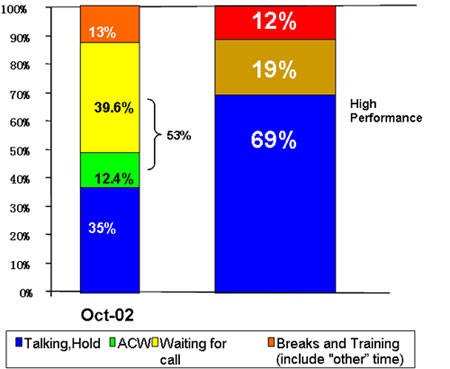 可以明顯看出,我們的客戶感受很不均勻,客戶有時(shí)覺(jué)得電話很容易接通,而有時(shí)又覺(jué)得非常難通, 30秒內(nèi)接起率不到80%,再來(lái)看看同期的員工利用率: