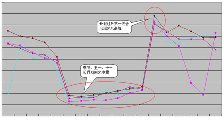 每年春節(jié)、五一、十一長(zhǎng)假期間前后的來(lái)電規(guī)律,七天長(zhǎng)假期間來(lái)電量很小,但長(zhǎng)假過(guò)后的第一天會(huì)出現(xiàn)來(lái)電高峰。