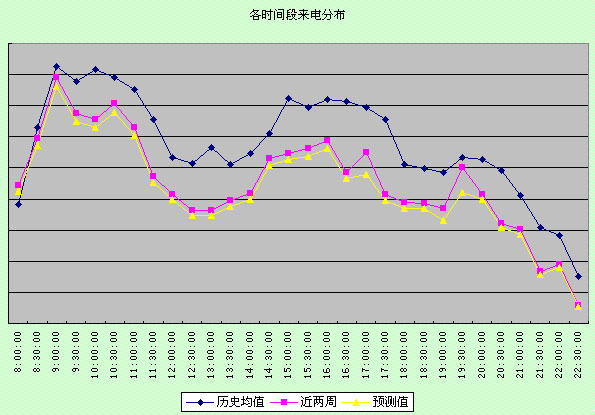 不同企業(yè)、不同業(yè)務(wù)排班周期可能不一樣,一般以周、兩周、月等為周期。排班周期的預(yù)測(cè)是用于進(jìn)行人員配備的基礎(chǔ),其參考的數(shù)據(jù)是年度預(yù)測(cè)值、招聘周期對(duì)該周期的預(yù)測(cè)值、前幾周的實(shí)際來(lái)電值,而且更傾向于實(shí)際來(lái)電情況,排班周期的預(yù)測(cè)需要注意的是應(yīng)按天和時(shí)段來(lái)進(jìn)行,一周中的各天可能來(lái)電規(guī)律是不一樣的,同樣一天中的各時(shí)段來(lái)電規(guī)律也不一樣。對(duì)于呼入的電話建議以每30分鐘的間隔來(lái)研究用戶來(lái)電的規(guī)律。排班周期預(yù)測(cè)的要點(diǎn)是:歷史看趨勢(shì),近期看實(shí)際,結(jié)合最近周期的來(lái)電及可預(yù)見(jiàn)的影響業(yè)務(wù)的因素對(duì)“直接計(jì)算”出來(lái)的數(shù)值進(jìn)行修正。如下例: