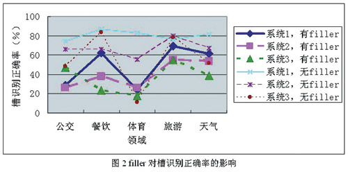 對于電話連續(xù)語音識別來說,由于錄制環(huán)境是辦公室真實(shí)環(huán)境,因此噪音并不是影響性能的主要因素。電話連續(xù)語音識別分為5個(gè)子領(lǐng)域,每個(gè)子領(lǐng)域各有一套語法。評測句子由語法生成的有效成分在前后加上任意長的填充詞(filler)構(gòu)成,如語法生成的句子為“從天安門到中關(guān)村怎么坐公交車”,而實(shí)際錄制的句子是“你好,請問從天安門到中關(guān)村怎么坐公交車,可以查到嗎?”,其中的“你好,請問”和“可以查到嗎”就是filler。由分析可以發(fā)現(xiàn),不同領(lǐng)域內(nèi)的槽識別正確率相差很大。這主要有兩個(gè)原因,一是不同領(lǐng)域的語法復(fù)雜度不同,二是不同領(lǐng)域內(nèi)有filler的句子所占比例不同。為了進(jìn)一步衡量filler對識別的影響,選取三個(gè)識別系統(tǒng),將有filler的句子和沒有filler的句子分別計(jì)算識別率,統(tǒng)計(jì)結(jié)果如圖2所示。從圖中可以看出,filler對識別的影響是相當(dāng)大的,無filler的句子比有filler的句子識別正確率可以高幾十個(gè)百分點(diǎn)。