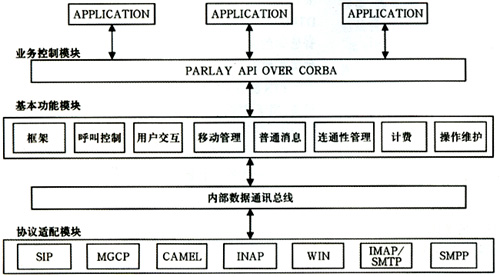 基本功能模塊是Parlay網(wǎng)關(guān)的控制管理層,包括呼叫控制(CallControl),用戶交互(UserInteraction),移動管理,普通消息,計費,操作維護,連通性管理,框架等子模塊。