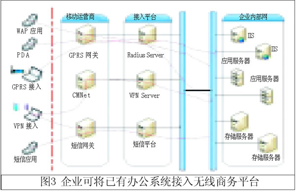 這里介紹的無線商務(wù)平臺適合沒有成型信息系統(tǒng)的企業(yè)接入,對于企業(yè)已經(jīng)建有辦公系統(tǒng)的情況,可以提供專線接入的無線商務(wù)解決方案(如圖3所示),企業(yè)通過專線接入無線商務(wù)平臺,這種情況需要對企業(yè)辦公系統(tǒng)進(jìn)行一定的改造來實現(xiàn)全部移動辦公功能。