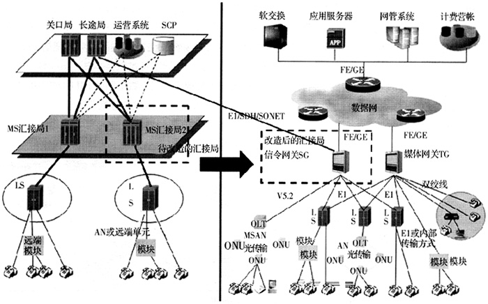 改造后的匯接局和端局之間通過(guò)ISUP中繼方式連接,接入網(wǎng)絡(luò)通過(guò)V5中繼接入。如果原有匯接局直接下掛部分用戶,這部分用戶可以采用中繼媒體網(wǎng)關(guān)下掛接入單元的方式接入。原有端局用戶的數(shù)據(jù)管理和業(yè)務(wù)提供統(tǒng)一由軟交換支持,端局用戶的業(yè)務(wù)觸發(fā)提升到匯接局,避免對(duì)端局的改造,同時(shí),用戶可以使用軟交換業(yè)務(wù)平臺(tái)提供的各類智能業(yè)務(wù)和增值業(yè)務(wù)。匯接局網(wǎng)絡(luò)優(yōu)化后,原有端局無(wú)法提供的業(yè)務(wù)均可以由軟交換業(yè)務(wù)系統(tǒng)提供。