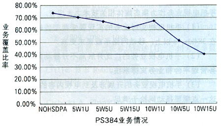 由圖1可知,當(dāng)HSDPA分配功率為5W時,HSDPA對網(wǎng)絡(luò)覆蓋沒有很大影響;當(dāng)它為10W時,如果HSDPA用戶數(shù)不大,影響也有限;但是,當(dāng)它為10W時,如果HSDPA用戶數(shù)持續(xù)增加,則會產(chǎn)生嚴重影響。在下行從NOHSDPA的74%降低到10W15U的40.62%時,PS384業(yè)務(wù)降低了近一半。同時,隨著業(yè)務(wù)速率的提高,網(wǎng)絡(luò)影響越大。另外,在一定的HSDPA功率分配前提下,隨著HSDPA用戶數(shù)的增加,過載率增大,網(wǎng)絡(luò)中高速數(shù)據(jù)業(yè)務(wù)的比例隨之減少,各點上的用戶速率不斷降低;同時,用戶的增多使得各小區(qū)的HSDPA發(fā)射功率不斷增大,導(dǎo)致區(qū)域中間各點的終端接收功率普遍增加。