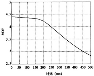 對(duì)實(shí)時(shí)的語音和視頻業(yè)務(wù)來說,業(yè)務(wù)數(shù)據(jù)端到端的時(shí)延最為關(guān)鍵,從仿真結(jié)果圖6和圖7可以看出時(shí)延對(duì)R系數(shù)和MOS值的影響:隨著時(shí)延的增加,R系數(shù)和MOS值都降低,即語音質(zhì)量變差。當(dāng)時(shí)延大于150ms時(shí),語音質(zhì)量下降的比較厲害。