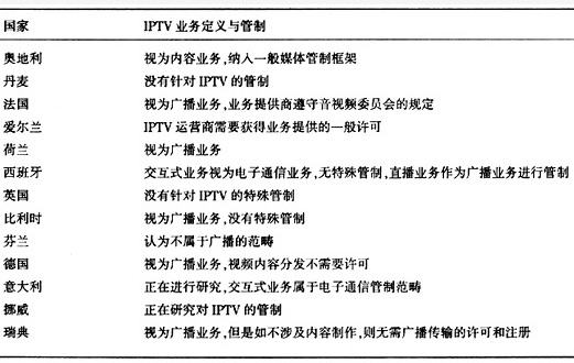 管制環(huán)境對IPTV的影響是根本性的。這種根本性主要體現(xiàn)在IPTV的準(zhǔn)入和業(yè)務(wù)劃分上,前者決定電信公司是否能夠經(jīng)營IPTV,后者則決定IPTV應(yīng)如何管理。