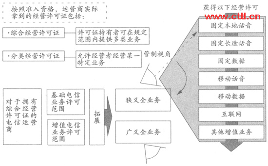 全業(yè)務可從電信管制、業(yè)務屬性及市場三個角度進行定義。全業(yè)務運營則可以從兩個角度來看待,一是從管制視角帶來的狹義全業(yè)務;一是從多業(yè)務領域與電信結合的廣義全業(yè)務。具體表述可參照圖1。