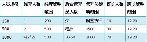 當(dāng)員工人數(shù)在150人的時(shí)候,班長(zhǎng)往往有10位左右。經(jīng)理能有足夠的精力來兼顧全局,甚至和大部分員工認(rèn)識(shí),親自制定關(guān)鍵流程和制度,參與每次的重要信息傳達(dá)。那么這個(gè)時(shí)候,經(jīng)理無疑是最為重要的管理者。班長(zhǎng)是第二重要的,后臺(tái)管理員(質(zhì)檢、維護(hù)、投訴處理、綜合行政等)就更多是個(gè)執(zhí)行角色。