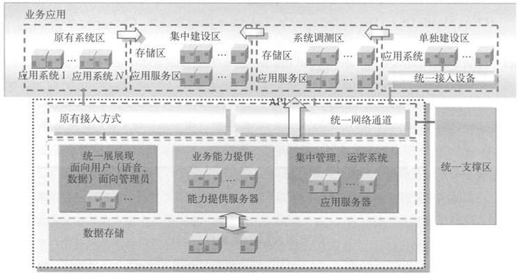 (5)應(yīng)用業(yè)務(wù)區(qū):統(tǒng)一搭建應(yīng)用硬件平臺(tái),實(shí)現(xiàn)應(yīng)用業(yè)務(wù)區(qū)業(yè)務(wù)應(yīng)用及業(yè)務(wù)能力提供區(qū)接入通道類型的新增,均可直接在其硬件平臺(tái)上加載應(yīng)用軟件、提供服務(wù),調(diào)用現(xiàn)有資源實(shí)現(xiàn)。個(gè)別因?yàn)橄到y(tǒng)本身需求需要單獨(dú)建設(shè)、部署的系統(tǒng)則保留其單獨(dú)建設(shè)的方式。