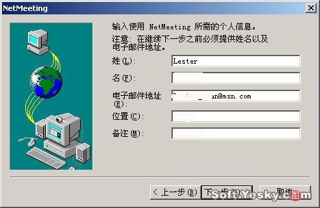 首次運行Netmeeting,軟件會出現(xiàn)一個向?qū),要求對用戶信息進行簡單的設定,單擊下一步,輸入個人信息,如圖4所示: