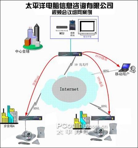 該方案有很強(qiáng)的針對性,作為主會場必須用10兆/20兆光纖接入INTERNET,且需要視頻交換處理設(shè)備MCU,而太平洋電腦網(wǎng)本身就具備雄厚的服務(wù)器作為基礎(chǔ)。廣州總公司還需要較高配置的視頻終端設(shè)備,在局域網(wǎng)網(wǎng)關(guān)上安裝較高配置路由器,主會場可以通過設(shè)置MCU隨時使某一分會場成為主席。