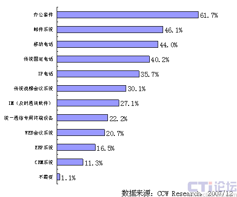 盡管統(tǒng)一通信的概念已經(jīng)被各大廠商廣為宣傳,統(tǒng)一通信的目標(biāo)是實(shí)現(xiàn)各種溝通方式的融合,但是從國(guó)內(nèi)的企業(yè)來(lái)看,他們對(duì)統(tǒng)一通信的認(rèn)識(shí)仍然還處于比較模糊的階段,那么從用戶(hù)本身來(lái)講,他們最需要統(tǒng)一通信能把哪些功能實(shí)現(xiàn)相互融合呢?2007年底,國(guó)內(nèi)ICT市場(chǎng)研究咨詢(xún)機(jī)構(gòu)計(jì)世資訊(CCW Research)對(duì)國(guó)內(nèi)的潛在用戶(hù)進(jìn)行了一次大樣本調(diào)研,被調(diào)研的企業(yè)數(shù)量超過(guò)800家,企業(yè)領(lǐng)域分布在各行各業(yè),重點(diǎn)以大中型企業(yè)為主,調(diào)研結(jié)果表明,目前國(guó)內(nèi)企業(yè)用戶(hù)希望能實(shí)現(xiàn)互聯(lián)互通功能排在第一位的是辦公套件、占到所有被調(diào)研對(duì)象的六成以上,其次是郵件系統(tǒng)和移動(dòng)電話,占近一半的比例,之后是固話、視頻會(huì)議和即時(shí)通信,而和用戶(hù)業(yè)務(wù)系統(tǒng)的整合,如ERP、CRM則排在最后。