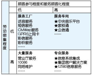 表1中以“★”標(biāo)識的服務(wù)基本上都是電信運營企業(yè)開展移動信息化后向客戶提供的服務(wù),可以明顯看出,更高的顧客參與度、更多的顧客化是這些服務(wù)的共同特點,所以,移動信息化運營的就是由服務(wù)工廠向服務(wù)車間轉(zhuǎn)型、由大量服務(wù)向?qū)I(yè)服務(wù)轉(zhuǎn)型。