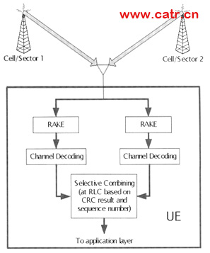 當終端用戶移動到不同基站下的小區(qū)分界處時候,采用宏分集技術(shù)同時接收來自兩個基站的電視數(shù)據(jù)(見圖3)。在實現(xiàn)宏分集技術(shù)時,要求網(wǎng)絡(luò)側(cè)針對同一MBMS業(yè)務(wù)在兩小區(qū)間進行內(nèi)容同步和一定程度上的時間同步。