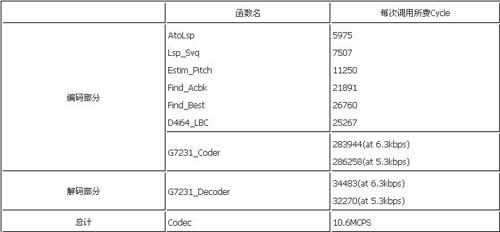 經(jīng)過C語言級和匯編級的多種優(yōu)化,最后實現(xiàn)了一路G.723.1的編解碼需要花費10.6MCPS,整個代碼的程序空間為208K byte(程序中包括了部分c6201的庫函數(shù)),數(shù)據(jù)空間為8K byte,碼本大小20k byte,多通道的上下文數(shù)據(jù)為1.48K byte。200MHz的C6201每秒可以實時編解碼16路語音信號。所有代碼全部通過了ITU-T測試矢量的測試。表1是各主要模塊的運(yùn)算量。