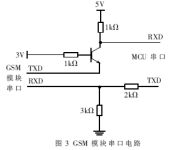 (2)串行接口電路的設(shè)計(jì)。GSM模塊的串行口(UART)使用的不是標(biāo)準(zhǔn)的TTL電平,不能與控制它的MCU串口直接相連,在它們之間要有一個(gè)電平轉(zhuǎn)換接口電路。該電路要能實(shí)現(xiàn)模塊的3V高電平與