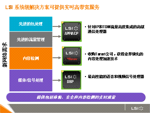 目前,只有很少的技術(shù)專家能夠向移動運(yùn)營商提供推出這些新服務(wù)所需要的世界級解決方案。因?yàn)檫@需要技術(shù)提供者在通信網(wǎng)絡(luò)領(lǐng)域有著深厚的專業(yè)精深技能和高度的系統(tǒng)級解決方案能力。在通信帶寬和實(shí)時業(yè)務(wù)提供及系統(tǒng)靈活性存在矛盾時,系統(tǒng)設(shè)計(jì)的挑戰(zhàn)變得至關(guān)緊要。 在其他廠商為解決其中任何之一的技術(shù)問題而忙碌的時候,世界上有哪個公司可以利用系統(tǒng)的通信處理器綜合設(shè)計(jì)(包括通信1-7層)將帶寬,實(shí)時和靈活性三者完美結(jié)合,他便是最終的贏家。LSI就是這些少數(shù)技術(shù)專家之一。它能提供一整套解決方案來提供實(shí)時高帶寬服務(wù),包括高級網(wǎng)絡(luò)通信處理器、內(nèi)容檢測技術(shù)和DSP技術(shù)。