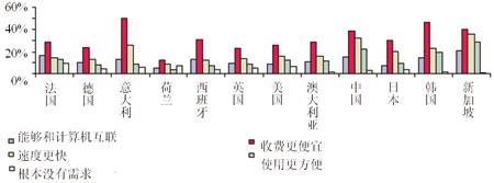 手機(jī)上網(wǎng)也受到一些用戶的歡迎,這得益于一些運(yùn)營(yíng)商為促進(jìn)移動(dòng)互聯(lián)網(wǎng)的推廣而越來(lái)越多地采取了手機(jī)上網(wǎng)打包套餐。此外,不同地區(qū)的用戶對(duì)使用手機(jī)上網(wǎng)的偏好不同,調(diào)查顯示,亞洲國(guó)家用戶使用手機(jī)上網(wǎng)的比例高于歐洲國(guó)家用戶。其中,日本的被調(diào)查者通過(guò)手機(jī)上網(wǎng)的比例明顯超過(guò)平均水平,這離不開NTTDoCoMo公司i-Mode的成功。有意思的是,中國(guó)緊隨日本排名第二,這有可能是因?yàn)橐苿?dòng)通信在中國(guó)的普及率并不高,目前的用戶對(duì)技術(shù)的領(lǐng)悟能力大大超過(guò)了其它國(guó)家的平均水平,也有可能是因?yàn)橐恍┍徽{(diào)查者用手機(jī)替代了固定電話,手機(jī)成為其上網(wǎng)的惟一途徑(見圖3)。展望未來(lái),Ovum認(rèn)為該領(lǐng)域充滿了期待。