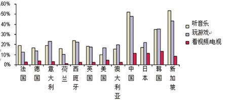 除打電話、發(fā)短信、拍照、手機(jī)郵箱以外,音樂、游戲也是用戶每周使用較多的業(yè)務(wù)。當(dāng)被問及其它應(yīng)用時(shí),來(lái)自中國(guó)、新加坡還有韓國(guó)的部分被調(diào)查者表示,他們會(huì)經(jīng)常用手機(jī)來(lái)聽音樂和玩游戲。其中,中國(guó)是惟一一個(gè)選擇用手機(jī)聽音樂的用戶數(shù)與選擇用手機(jī)拍照的用戶數(shù)旗鼓相當(dāng)?shù)膰?guó)家。但有趣的是,手機(jī)在中國(guó)不太可能成為MP3的替代品,仍然只是一個(gè)便攜播放器。在新加坡,手機(jī)替代MP3的可能性就大多了。Ovum認(rèn)為,這是由于高端手機(jī)在新加坡市場(chǎng)占有很高的比例。在歐洲和美國(guó),使用手機(jī)來(lái)聽音樂和玩游戲的比例則比亞洲少了很多,但值得鼓勵(lì)的是仍有超過(guò)10%的被調(diào)查者選擇了該答案。(見圖2)