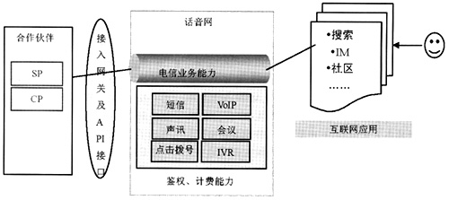 用戶不再是直接通過電話終端使用話音應(yīng)用,而是通過PC(或PDA等)在互聯(lián)網(wǎng)應(yīng)用中使用話音業(yè)務(wù),因此操作界面非常友好,互聯(lián)網(wǎng)應(yīng)用在后臺通過調(diào)用電信業(yè)務(wù)平臺的接口能力使用話音網(wǎng)絡(luò)資源能力,這些網(wǎng)絡(luò)資源能力包括VoIP、點擊撥號、短信、多方會議、聲訊、IVR等,因此話音網(wǎng)資源借助豐富的互聯(lián)網(wǎng)應(yīng)用激發(fā)了潛力。