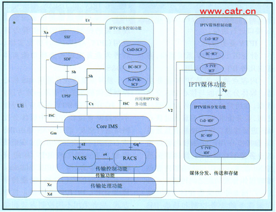 Release 1的研究成果上,其中包含了已有的NASS和RACS子系統(tǒng),并適當加入與IPTV相關(guān)的網(wǎng)絡功能實體來實現(xiàn)對IPTV業(yè)務的擴展。(如圖2所示)