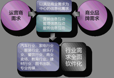 基于這個(gè)需求,那么運(yùn)營(yíng)商更需要的是針對(duì)行業(yè)版的解決方案,有許多的行業(yè)正在期待獲得這樣的商業(yè)信息化平臺(tái),包括:汽車行業(yè)、家電行業(yè)、服裝行業(yè)、娛樂(lè)行業(yè)、餐飲行業(yè)、商業(yè)賣場(chǎng)、教育行業(yè)、建材行業(yè)、圖書(shū)出版、專業(yè)傳媒等。