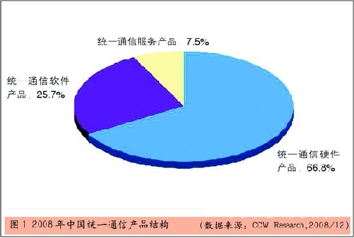 從產(chǎn)品結(jié)構(gòu)角度分析,雖然受硬件設(shè)備價格因素的影響,統(tǒng)一通信設(shè)備市場仍然是通信市場中最大份額的一部分,市場份額占到66.8%。而且隨著企業(yè)用戶對于統(tǒng)一通信理解能力的加深,統(tǒng)一通信軟件產(chǎn)品與統(tǒng)一通信服務(wù)越來越受到更多企業(yè)的認(rèn)同。與2007年相比,統(tǒng)一通信軟件和服務(wù)產(chǎn)品市場份額有一定比例的增加。2008年,統(tǒng)一通信軟件產(chǎn)品達(dá)到市場份額的25.7%,特別是統(tǒng)一通信服務(wù)產(chǎn)品,增長迅速,市場份額超過7.5%。