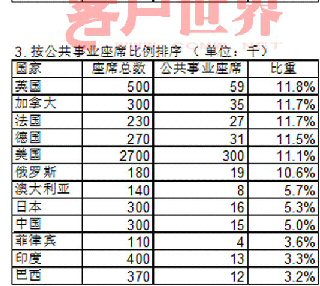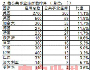 美國擁有全世界最多的座席,達到270萬個,公共事業(yè)座席30萬個,占11.1%;除美國以外,公共事業(yè)類座席總數排名在第2~6名的依次是:英國,加拿大,德國,法國,俄羅斯。