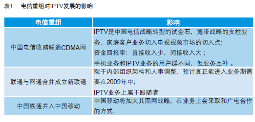 從目前IPTV業(yè)務(wù)發(fā)展的現(xiàn)狀來看,IPTV直接拉動了電信寬帶業(yè)務(wù)的發(fā)展,同時降低了寬帶用戶流失的風險,提升了用戶黏度。因此,在寬帶競爭日益激烈的未來,IPTV將會更加得到運營商的重視。重組后三家運營商都成為全業(yè)務(wù)運營商,IPTV和手機的結(jié)合將為IPTV業(yè)務(wù)拓展開辟新的渠道。