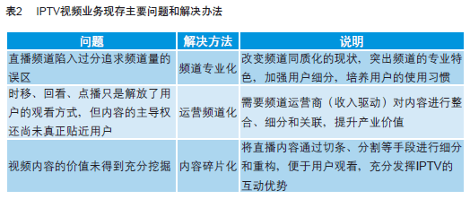 IPTV發(fā)展中,傳統(tǒng)視頻業(yè)務(wù)既是切入點,也是業(yè)務(wù)收入的重要來源。但目前視頻業(yè)務(wù)的價值還未得到充分體現(xiàn),互動性優(yōu)勢還未得到充分挖掘。主要問題和解決辦法如表2所示。
