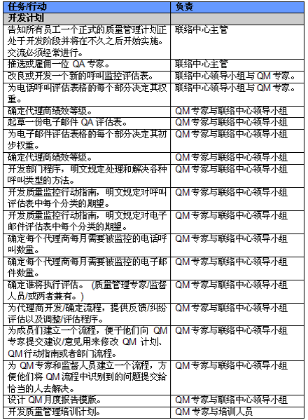 4. 開展項(xiàng)目交流。管理人員必須就新的或者修繕后的QM計(jì)劃與代理商進(jìn)行交流。QM的成功與否與代理商的合作密不可分,如果代理商受邀參與新QM計(jì)劃的開發(fā)并且所有改變都在雙方之間明確交流過,那么成功的機(jī)會也將大大提高。交流的內(nèi)容應(yīng)包括為什么要開發(fā)這樣一個(gè)計(jì)劃,它的作用和職責(zé)是什么,它對代理商會產(chǎn)生哪些影響(對于他們的評估和提升)以及它能帶來哪些好處。幫助代理商認(rèn)識到QM計(jì)劃積極的一面很重要,因?yàn)橹挥羞@樣才能讓他們看到QM不僅僅是管理人員用來告訴他們做錯了事情的一種手段。讓聯(lián)絡(luò)中心全體員工參與QM計(jì)劃的開發(fā)能夠建立他們對該計(jì)劃的支持,提高接受度的同時(shí)避免不知所措。這對聯(lián)絡(luò)中心剛剛嶄露頭角,QM計(jì)劃還未全面鋪開的中國市場而言尤為重要。
