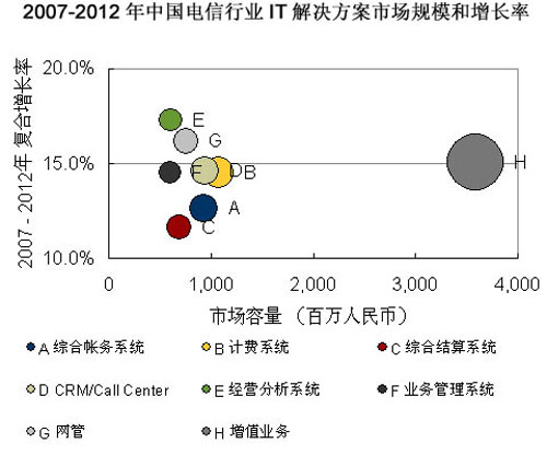 巨大的電信市場(chǎng)蛋糕給產(chǎn)業(yè)鏈的各級(jí)廠商都帶來(lái)良好的發(fā)展機(jī)遇,而其運(yùn)營(yíng)支撐系統(tǒng)市場(chǎng)無(wú)疑將是增長(zhǎng)最快的一部分。據(jù)市場(chǎng)調(diào)查機(jī)構(gòu)IDC預(yù)計(jì),2007年-2012年電信行業(yè)將注重運(yùn)營(yíng)支撐系統(tǒng)的全業(yè)務(wù)運(yùn)營(yíng)整合和支持前端業(yè)務(wù),因此3G增值業(yè)務(wù)、經(jīng)營(yíng)分析系統(tǒng)、客戶關(guān)系管理系統(tǒng)、IT服務(wù)管理系統(tǒng)等建設(shè)將實(shí)現(xiàn)快速增長(zhǎng)。運(yùn)營(yíng)商的已有項(xiàng)目仍然會(huì)持續(xù)升級(jí)維護(hù),以及配合全業(yè)務(wù)運(yùn)營(yíng)作出功能上的提升。IDC預(yù)計(jì),2012年電信行業(yè)IT解決方案整體市場(chǎng)規(guī)模將達(dá)到193.5億元人民幣。