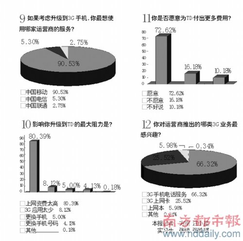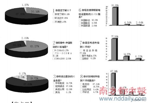 1、中國移動的3G口號是?超過98%的被訪者選擇了“引領(lǐng)3G生活”這一正確選項。2、你是否考慮升級到3G手機?選擇“會升級”的接近80%。如果考慮升級到3G手機,你最想使用哪家運營商的服務?中國移動奪得了超過九成的選票。但當最后問到,“你印象中,中國移動的3G標準是?”時,正確選項T D -SCD M A的得票率竟只有三成左右。