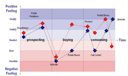 看一看“情感曲線”也許你就會(huì)頓悟。此處所示的兩條曲線來(lái)自?xún)蓚(gè)國(guó)際銀行。請(qǐng)注意曲線的不同之處。紅線所示的銀行與藍(lán)線所示的銀行相比在呼叫中心服務(wù)和店內(nèi)體驗(yàn)上都要略勝一籌。而藍(lán)線所示銀行在網(wǎng)上銀行這一項(xiàng)上表現(xiàn)更好!凹t線”銀行的競(jìng)爭(zhēng)資本是其卓越的客戶(hù)互動(dòng)體驗(yàn),無(wú)論是分行的面對(duì)面互動(dòng)還是來(lái)自聯(lián)絡(luò)中心的遠(yuǎn)程體驗(yàn)都屬一流。