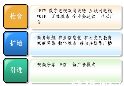 從廣義上講,廣電、電信、互聯(lián)網(wǎng)都屬于信息行業(yè),現(xiàn)在都面臨著自己在增長中遇到的問題,也就是滯漲。滯漲逼迫大家必須去轉(zhuǎn)型,轉(zhuǎn)型現(xiàn)在有三種方式,一個是搶,一個是擴(kuò),一個是引進(jìn)。從最近會議上來看,目前大家對搶食比較感興趣,畢竟有現(xiàn)成的一碗紅燒肉已經(jīng)做好了,對后面兩個,相對來說談得還比較少,因為后面兩個,需要引入一些創(chuàng)新的技術(shù),引入創(chuàng)新的思維。