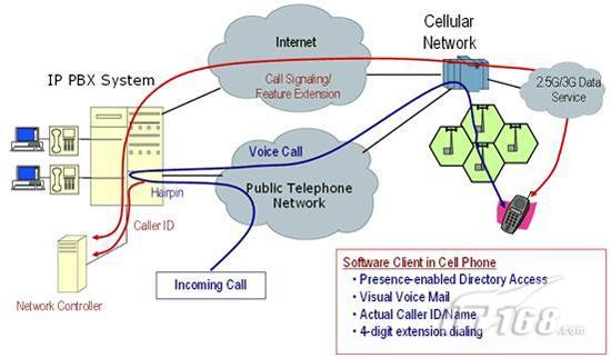 Sprint-Nextel最近推出了一種運(yùn)用Femtocells技術(shù)、類似cFMC的解決方案,稱為Airave。按照這個方案,用戶把蜂窩通信網(wǎng)絡(luò)的一個小型基站同基地的寬帶互聯(lián)網(wǎng)連接在一起。如圖1所示,這兩種方案都是利用寬帶互聯(lián)網(wǎng)和蜂窩通信網(wǎng)絡(luò)其中之一實現(xiàn)Voip,不同的區(qū)別只是本地的無線連接是運(yùn)用Wi-Fi技術(shù)還是蜂窩通信網(wǎng)絡(luò)。對企業(yè)用戶而言,主要缺點是,這兩種實現(xiàn)方式提供的都是由用戶主導(dǎo)的單一語音服務(wù),而沒有面向企業(yè)PBX或移動UC系統(tǒng)的接口。