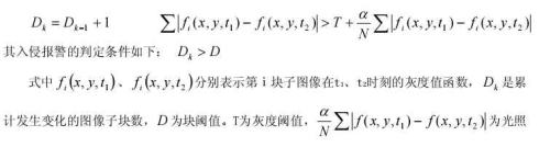 本設(shè)計中采集的是灰度圖像,為了實現(xiàn)入侵掃描功能,要求能夠存儲兩場圖像。考慮到檢測實時性要求,采用基于幀間差分的變化檢測。檢測運動目標時,考慮到對目標大小的選擇性以及為了克服光照變化引起的虛警報, 在幀間差分基礎(chǔ)上,引入圖像塊概念,將圖像分成M個n×n的子塊,判斷每一子塊圖像是否發(fā)生變化,統(tǒng)計發(fā)生變化的子塊數(shù)目,判斷式為: