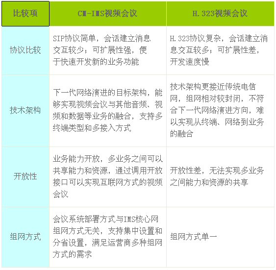 IMS是下一代網(wǎng)絡(luò)演進的核心技術(shù),基于中國移動CM-IMS的視頻會議在全面支持語音、視頻、數(shù)據(jù)會議和高清會議功能的同時,有效解決了傳統(tǒng)H.323會議系統(tǒng)互通性差、終端要求高、業(yè)務(wù)可擴展性低等問題,成為中國移動視頻會議發(fā)展的主流技術(shù)。CM-IMS的視頻會議與傳統(tǒng)的H.323會議相比,具有以下技術(shù)優(yōu)勢: