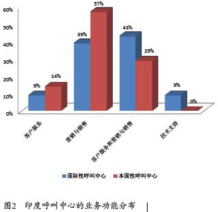 印度的呼叫中心可分為兩類:一類面向國(guó)際市場(chǎng),另一類服務(wù)本國(guó)市場(chǎng)。如班加羅爾等6個(gè)城市的60家呼叫中心中,74%(44家)專門服務(wù)于國(guó)際市場(chǎng),26%(16家)服務(wù)于本國(guó)市場(chǎng)。