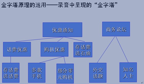 在錄音分享之前,首先慧聰鄧白氏研究人員跟電客們交流了金字塔理論的原理,說明金字塔對(duì)寫作、思考和分析問題的過程可進(jìn)行指導(dǎo)。接著是聽錄音,讓電客根據(jù)金字塔原理討論、分析錄音的優(yōu)缺點(diǎn)。然后慧聰鄧白氏研究研究員把事先從錄音中聽到的金字塔結(jié)構(gòu)呈現(xiàn)出來(lái),如下所示: