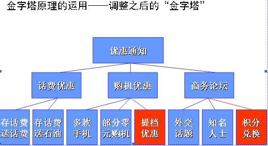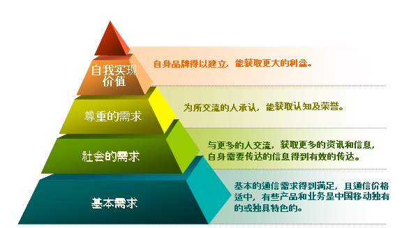 慧聰鄧白氏研究認(rèn)為,客戶在使用通信產(chǎn)品的時(shí)候也大致可分為四個(gè)需求層次,第一層是基本需求,如基本的通信需求(電話/短信)得到滿足,且價(jià)格適中,有些產(chǎn)品和業(yè)務(wù)是中國(guó)移動(dòng)獨(dú)有的或獨(dú)具特色的;第二層是社會(huì)的需求,(使用中國(guó)移動(dòng))與更多的人交流,獲取更多的資訊和信息,且自身需要傳達(dá)的信息也得到有效的傳達(dá);第三層是尊重的需求,即為所交流的人承認(rèn),能獲知認(rèn)知及榮譽(yù);第四層是自我實(shí)現(xiàn)價(jià)值的需求,即(通過使用移動(dòng)通信業(yè)務(wù))自身品牌得以建立,能獲取更大的利益。