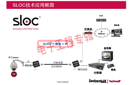 革命性的Intersil Techwell SLOCTM(Security Link over Coax)同軸電纜復(fù)合視頻傳輸解決方案是可通過一條同軸電纜同時(shí)傳輸模擬 CVBS 視頻和高清數(shù)字 IP 視頻信號(hào)的先進(jìn)調(diào)制解調(diào)器解決方案,其采用最新MODEM PHY技術(shù)的傳輸解決方案,可以基于同軸電纜同時(shí)傳輸高清IP碼流和標(biāo)清模擬實(shí)時(shí)視頻。