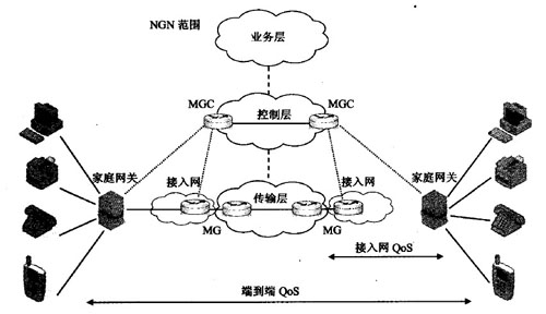 RG也是整個家庭網(wǎng)絡與外部網(wǎng)絡聯(lián)系的橋梁,是數(shù)字家庭各種業(yè)務和應用的關鍵。ITU-T 已經(jīng)將家庭網(wǎng)絡納入NGN(新一代網(wǎng)絡)的一部分,而RG將在其中扮演重要角色,RG在NGN中的位置及其與外部的連接如圖2所示,MGC為媒體網(wǎng)關控制器,MG為媒體網(wǎng)關。
