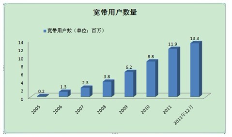 去年進(jìn)行的3G/BWA牌照拍賣有望成為一個催化劑,將寬帶接入擴(kuò)展到印度最偏遠(yuǎn)的地方。印度電信市場正在經(jīng)歷“信息革命”。為了促進(jìn)寬帶的普及,政府已經(jīng)公布并實(shí)施了多項(xiàng)政策(見方框3)。得益于這些政策的實(shí)施,寬帶用戶數(shù)從2005年的18萬增加到2011年3月的1187萬,2011年底達(dá)到1330萬。