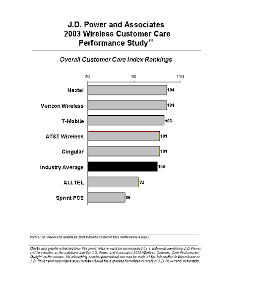 Nextel和Verizon移動(dòng)在全部七家大型移動(dòng)服務(wù)提供商的客戶(hù)服務(wù)表現(xiàn)中并列前茅。Nextel在自動(dòng)應(yīng)答系統(tǒng)方面的表現(xiàn)特別好,尤其是指引/提示部分。Verizon移動(dòng)則是在所有各個(gè)方面都表現(xiàn)超過(guò)平均值,特別是讓客服代表理解客戶(hù)的問(wèn)題和比較短的打入客服中心后的電話等待時(shí)間方面。