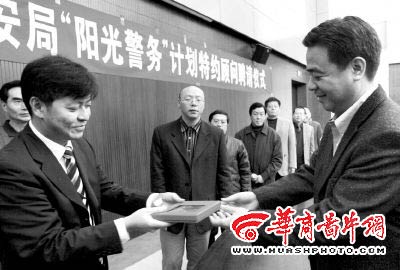 昨日下午2時(shí)許,重慶市公安局“陽(yáng)光警務(wù)”特約顧問(wèn)聘請(qǐng)儀式上,重慶市公安局副局長(zhǎng)、政治部主任彭長(zhǎng)健頒發(fā)了特約顧問(wèn)聘書。重慶市社會(huì)科學(xué)院研究員孫元明等18人成為我市警方首批聘請(qǐng)的“陽(yáng)光警務(wù)”特約顧問(wèn)。他們將作為警方的“智囊團(tuán)”直接參與、監(jiān)督警務(wù)活動(dòng),聘任時(shí)間為兩年。