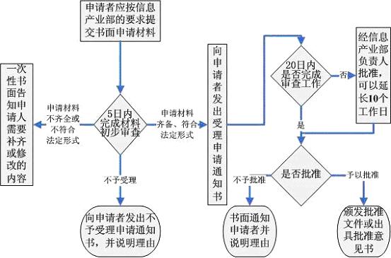 信息產(chǎn)業(yè)部或者省、自治區(qū)、直轄市通信管理局應(yīng)當自發(fā)出受理申請通知書之日起20個工作日內(nèi)完成審查工作,作出批準或不予批準的決定。20個工作日內(nèi)不能做出決定的,經(jīng)信息產(chǎn)業(yè)部或者省、自治區(qū)、直轄市通信管理局負責人批準,可以延長10個工作日,并將延長期限的理由告知申請人。予以批準的,出具正式批準文件;不予批準的,書面通知申請人并說明理由。