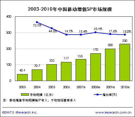 iResearch艾瑞市場咨詢研究成果《2007年移動(dòng)增值研究報(bào)告》顯示,2006年中國移動(dòng)增值SP市場規(guī)模達(dá)到117億元,比2005年增長14.7%,近兩年移動(dòng)增值SP市場受政策因素影響增長相對平緩,但隨著市場環(huán)境的成熟,3G商用和2008年奧運(yùn)都將對SP移動(dòng)增值市場有所推進(jìn),預(yù)計(jì)未來幾年中國移動(dòng)增值市場又會迎來一個(gè)新的發(fā)展高潮,艾瑞研究預(yù)測到2008年移動(dòng)增值SP市場規(guī)模將達(dá)到170億元,預(yù)計(jì)未來四年中國移動(dòng)增值市場規(guī)模將持續(xù)增長。